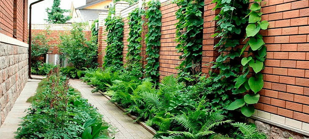 Клумба из кирпича вдоль забора