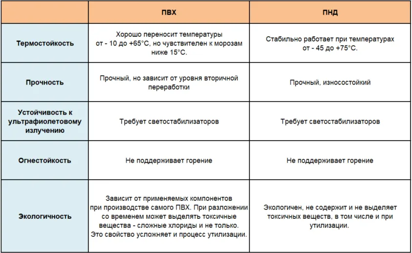 Это термопластичный полимер этилена высокой плотности и твердости за счет сильных связей между молекулами. Он отличается хорошей ударопрочностью, эластичностью, не пропускает воду. Это первичное полимерное сырье. Поэтому активно используется для изготовления как технической продукции, так и изделий, которые напрямую контактируют с пищевыми продуктами, питьевой водой, косметикой и лекарствами.Сравнительная таблица характеристик ПНД и ПВХ для производства изделий